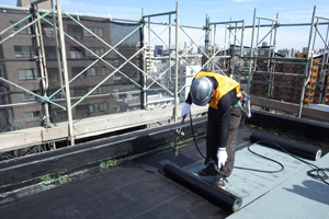 屋上の防水は紫外線、雨、雪などの影響を建物の中で一番受ける部位で耐久性が求められます。 漏水事故が発生すると最上階に居住させるお客様の部屋内や共用部などへ雨水が浸入し生活に大きな支障を及ぼす場合があり非常に重要な役割を果たす仕上げ材です。 一般的にはアスファルト防水の仕上げとなっておりますが、形状や機能性によってはウレタン防水やシート防水なども使用されております。 |